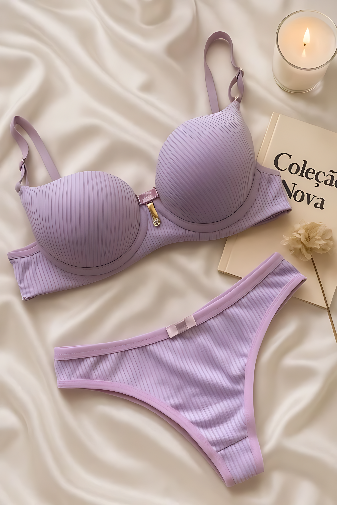 Conjunto em tom lilás suave, perfeito para quem ama delicadeza e conforto no dia a dia. O sutiã possui modelagem que valoriza o busto com sustentação e caimento perfeito, enquanto a calcinha garante ajuste leve e confortável ao corpo. Confeccionado em tecido macio com textura canelada, oferece toque suave na pele e liberdade de movimento. Um conjunto clean, feminino e elegante para você se sentir linda e confortável em todos os momentos. Disponível nos tamanhos P, M e G.